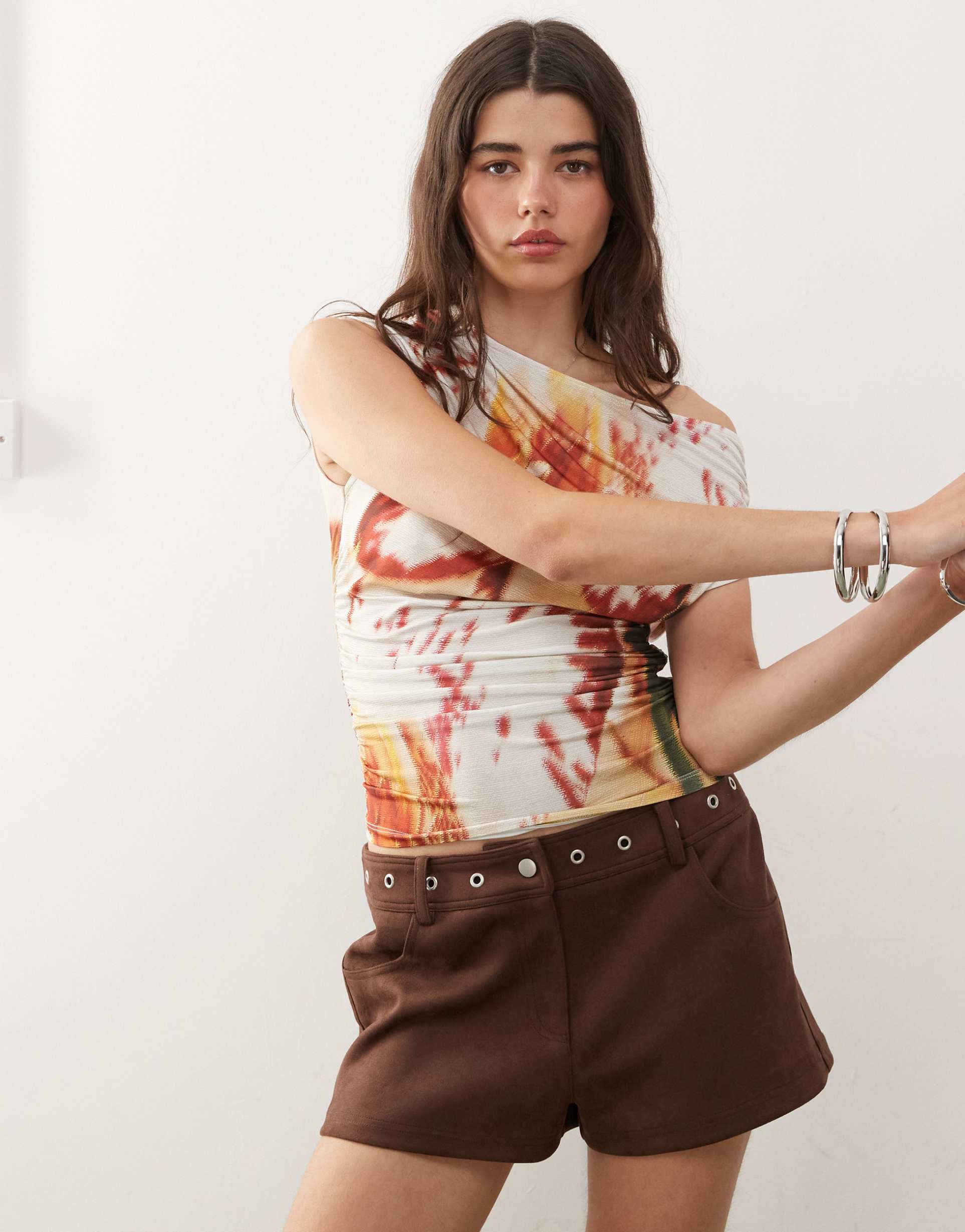 COLLUSION OFF SHOULDER SLINKY BLURRED ORANGE ORCHID TOP