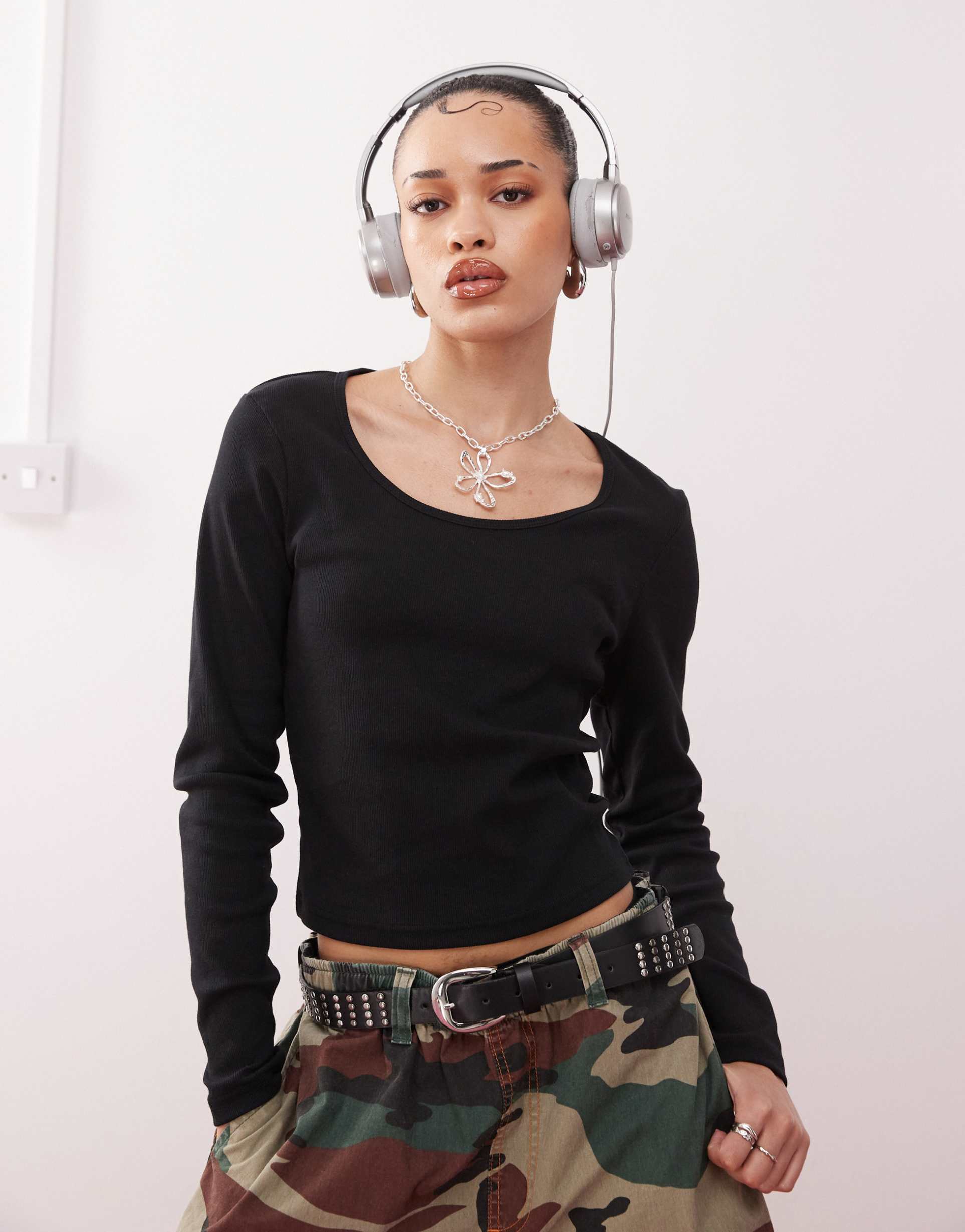 Soft ribbed cotton jersey and a square neckline define this long sleeve top with a regular fit and waist length hem. Its minimalist matte black tone and classic silhouette make it a versatile piece for casual outings, everyday wear, or street style looks. The stretchy fabric offers comfort and ease, while the long sleeves and covered back ensure season-spanning wearability. Pair it with jeans or camo pants for an understated yet stylish ensemble.