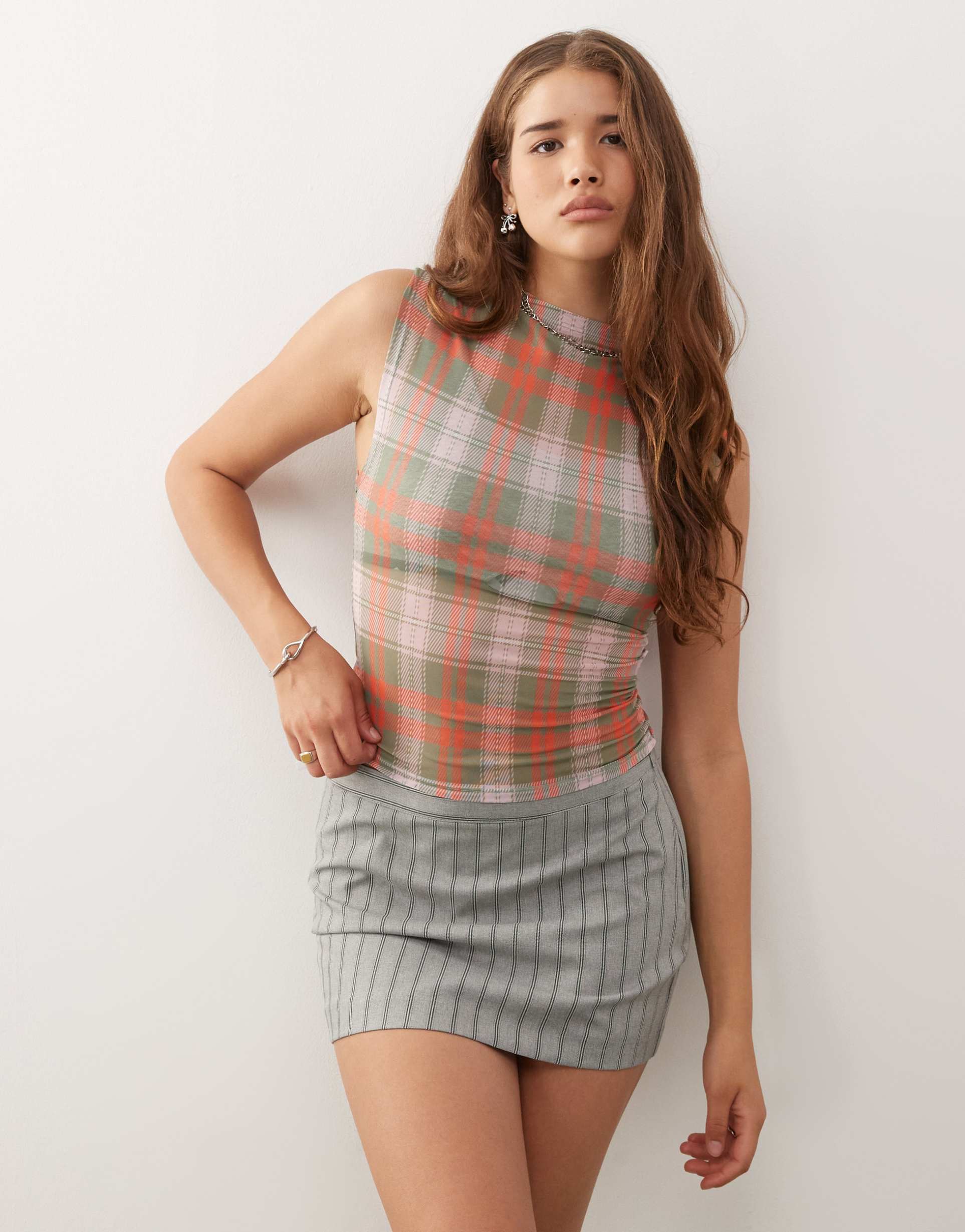 A sheer plaid mesh shell top featuring a sleek funnel neck and sleeveless design, crafted in a fine, stretchy polyester-elastane blend. Its slim fit and waist-length cut offer a modern silhouette perfect for casual days, streetwear vibes, or relaxed brunch outings. The multi-colour plaid pattern adds subtle dimension against the matte beige base, blending dusty gray and muted orange tones. Lightweight and breathable, this top balances style and comfort seamlessly for spring and summer seasons.