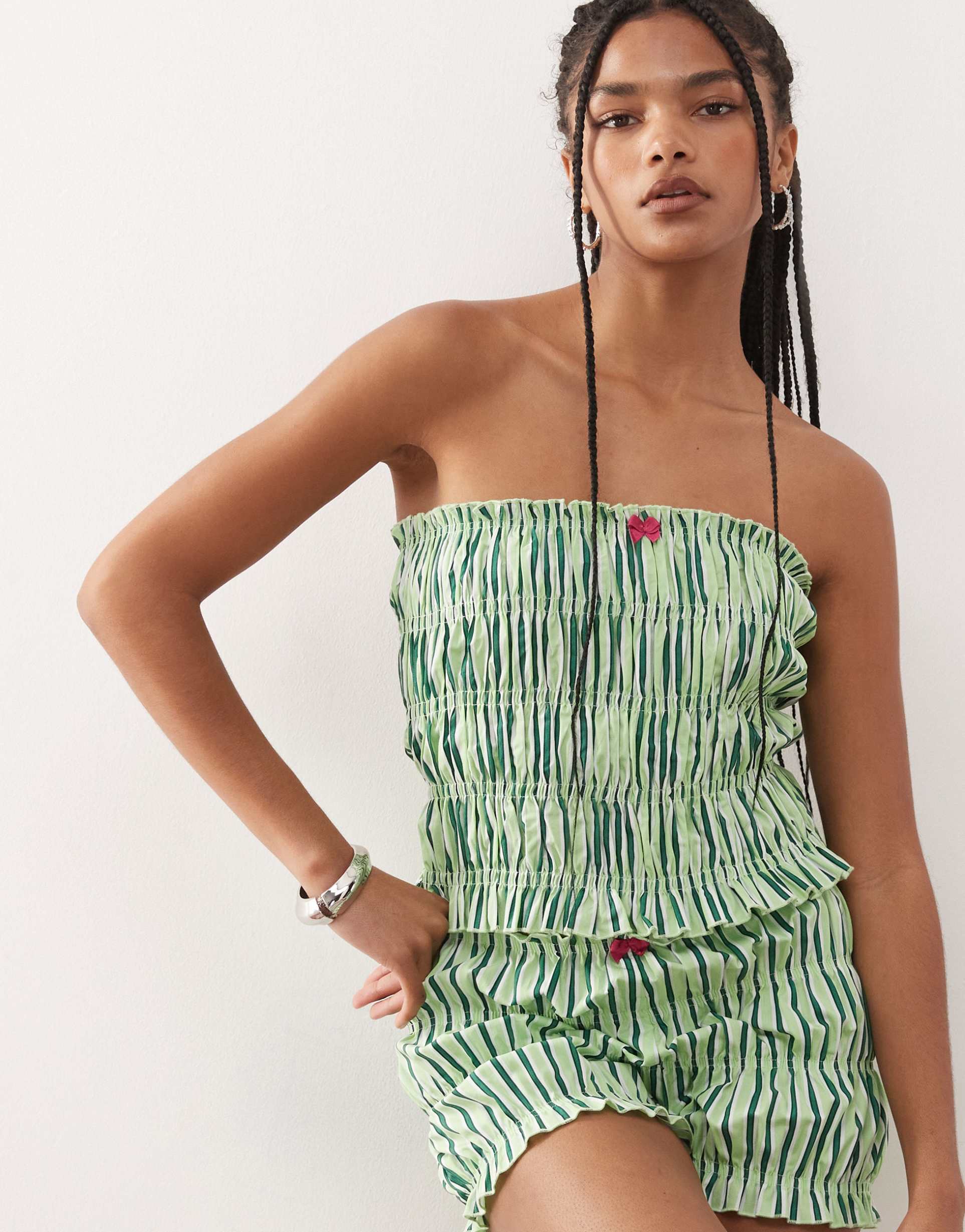 COLLUSION SHIRRED BANDEAU TOP IN GREEN STRIPE - PART OF A SET