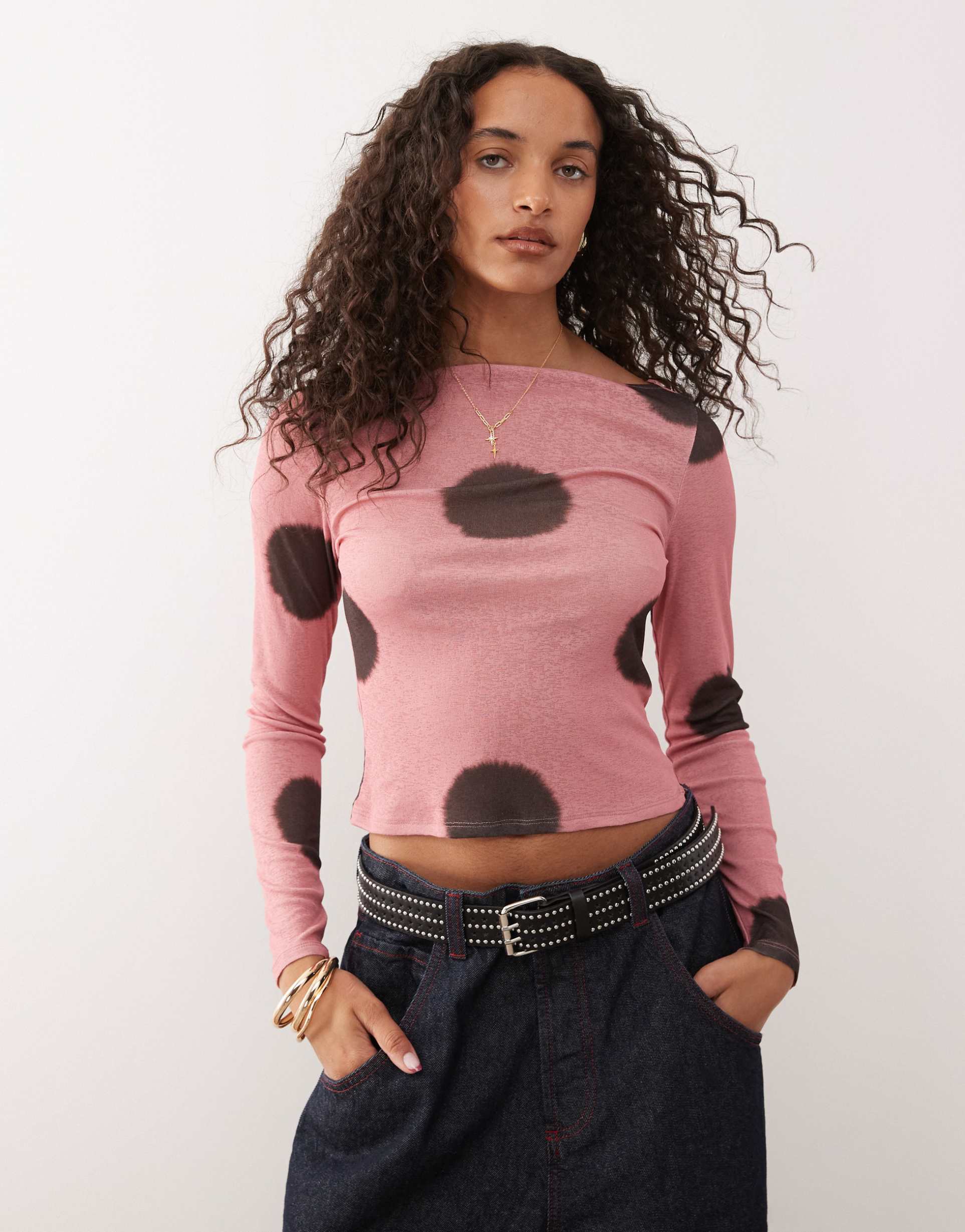 COLLUSION SLASH NECK LONG SLEEVE TOP IN PINK POLKA DOT