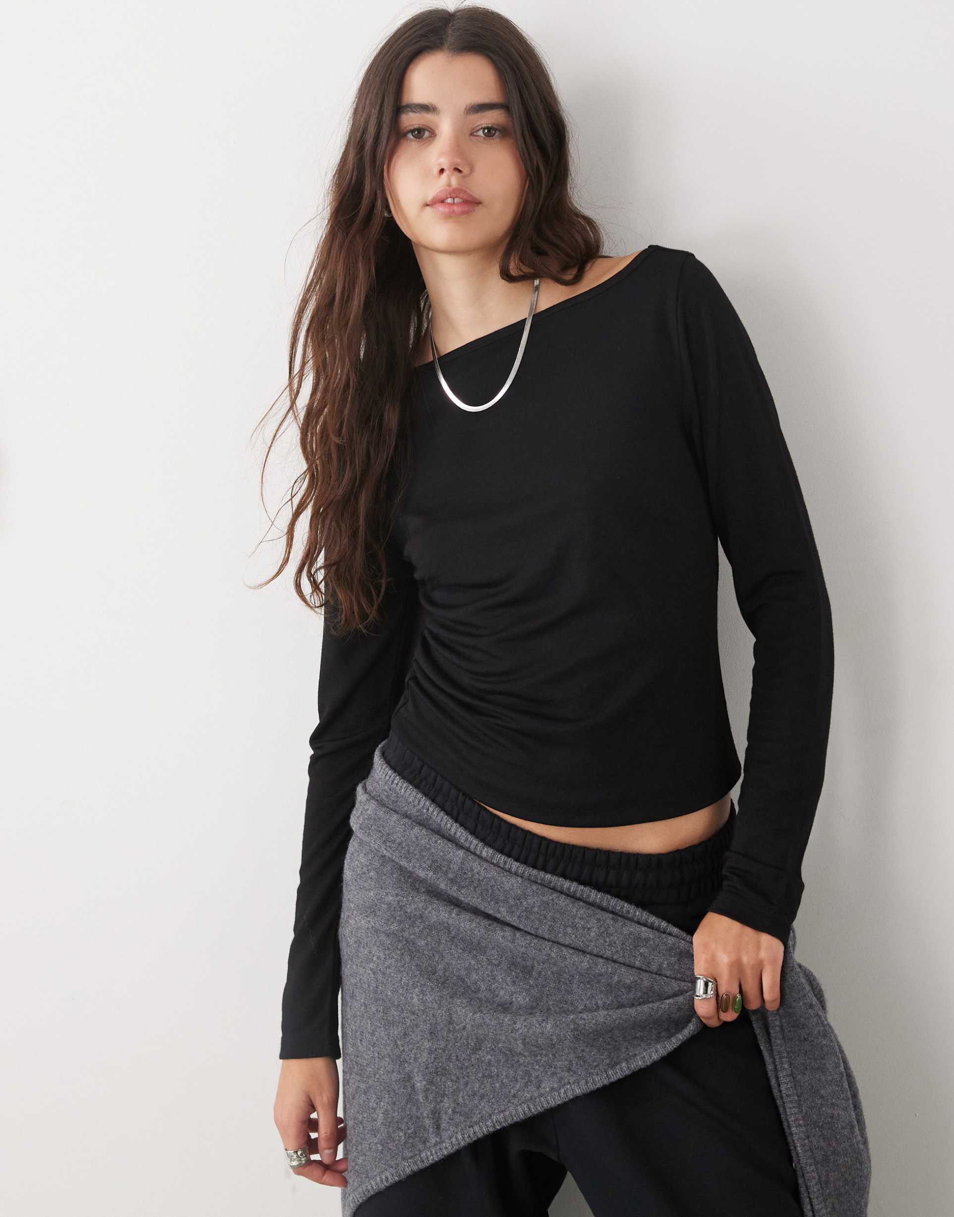 Soft and stretchy polyester-viscose blend defines this minimalist black long sleeve shell top featuring a distinctive slash neck and subtle front ruching. The regular fit and hip-length hem create a versatile piece perfect for everyday wear, casual outings, or workwear settings. Its textured fabric adds an understated modern touch, while the covered back and regular sleeves ensure comfort and ease. Elevate your essentials with this sleek and stylish top that effortlessly blends comfort and contemporary design.