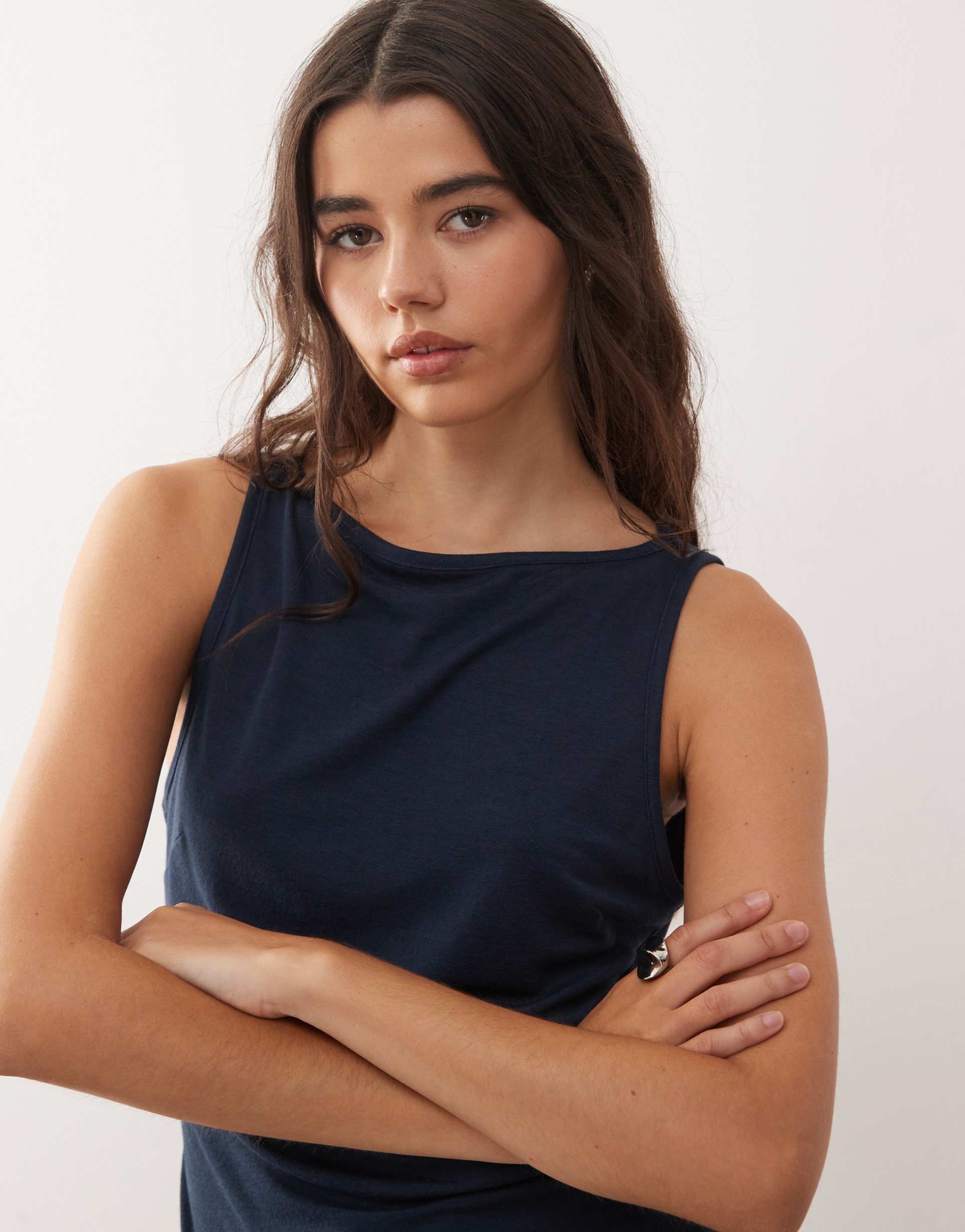 Soft and stretchy polyester-viscose fabric combines with a textured navy finish to create this slim fit tank top. The sleeveless design and distinctive slash neckline add a modern minimalist edge, while the waist-length hem ensures versatile styling. Ideal for casual outings, everyday wear, and travel, this top pairs effortlessly with a variety of bottoms to suit warm spring and summer days. Its clean silhouette and subtle texture make it a reliable staple for a chic, laid-back look.