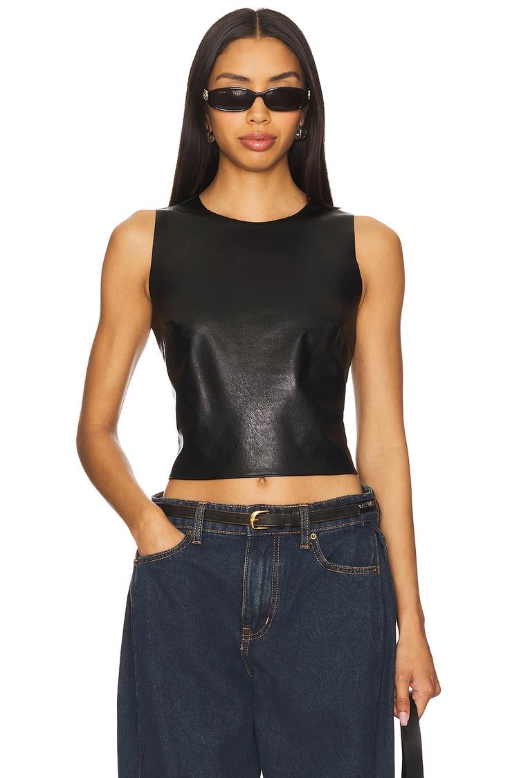 Matte black midweight faux leather defines this fitted cropped shell top with a classic round neckline and sleeveless strapless styling. The minimalist modern silhouette offers a chic touch for versatile day-to-night looks. Its pullover construction and covered back provide sleek simplicity, making it a perfect choice for casual outings, streetwear ensembles, and stylish night outs. Crafted with a blend of leather, viscose, and elastane, this top delivers comfort alongside its edgy appeal, ideal for all-weather wear.