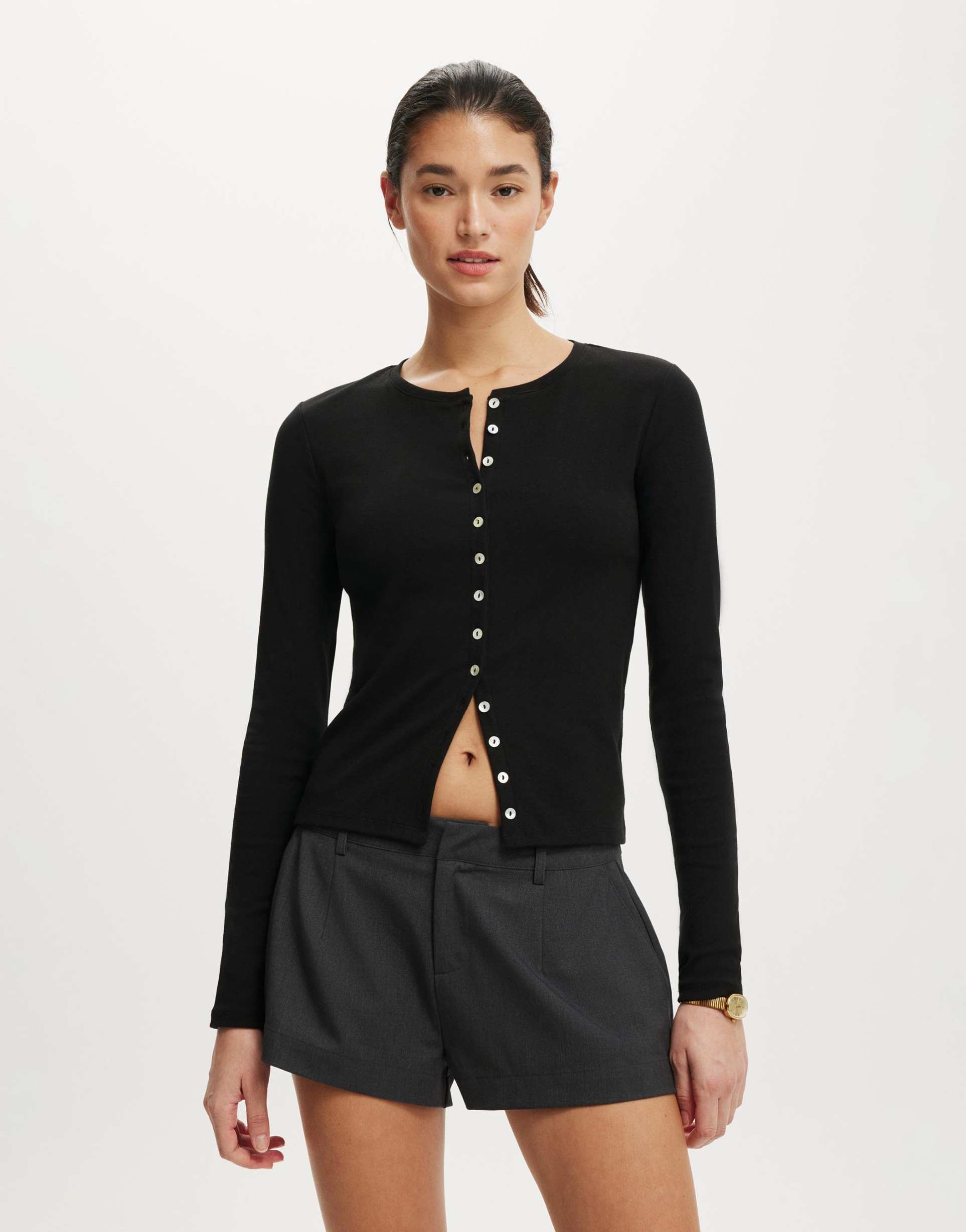 COTTON ON BAILEY BUTTON DETAIL CARDI IN BLACK
