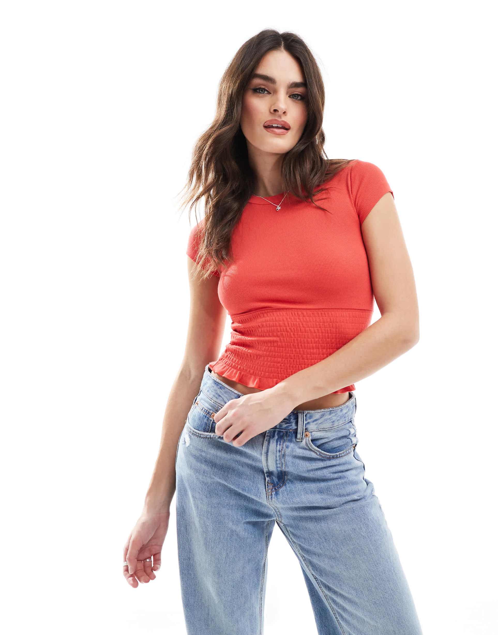 COTTON ON PIA SHIRRED SHORT SLEEVE TOP IN ORANGE