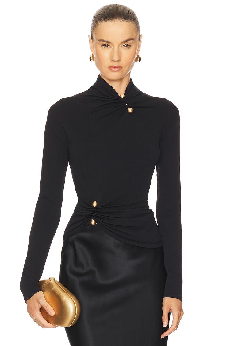 Ribbed jersey fabric with brushed brass-tone barbell hardware at neckline and hem