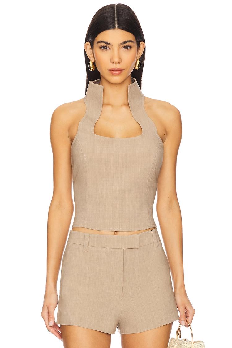 Soft wool blend twill fabric shapes this fitted tank top featuring a sleek high neckline and sleeveless strapless styling. The waist-length cut complements tailored shorts or skirts perfectly, while the hidden side zipper ensures a smooth silhouette. Its matte beige hue and minimalist solid design make it a versatile piece ideal for casual outings, brunch dates, or sophisticated night events during spring, summer, or autumn seasons.