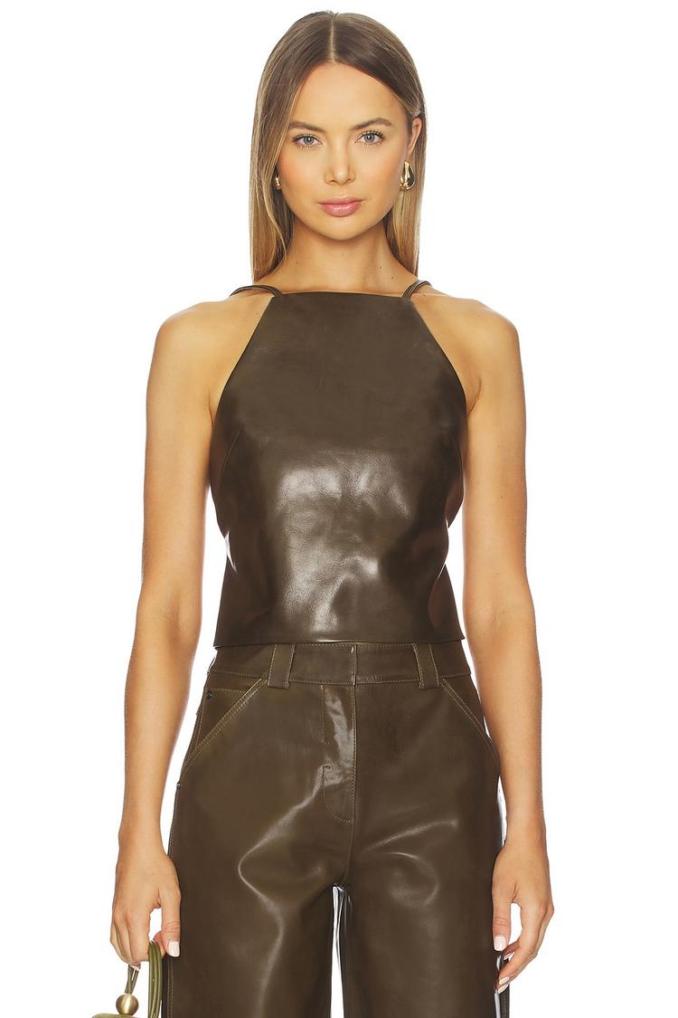 Sleek and modern, this cropped Juji Top crafted from midweight matte dark brown lamb leather offers a fitted silhouette with a high neckline and sleeveless design. The adjustable buckle straps at the back add both style and a customizable fit. Perfect for casual outings, date nights, or evening events, this chic leather top pairs effortlessly with high-waisted bottoms for a bold, sophisticated look.