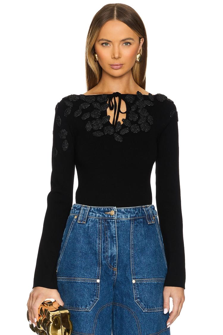 Crafted from a midweight viscose and nylon knit, this fitted shell top in matte black features a sophisticated keyhole neckline with a delicate tie closure. The standout 3D tonal florettes appliqued across the front, back, and shoulders add elegant texture to the hip-length silhouette with long regular sleeves. Its classic and chic style makes it perfect for casual days, workwear, business casual settings, and brunch or date nights, offering versatile refinement in any wardrobe.
