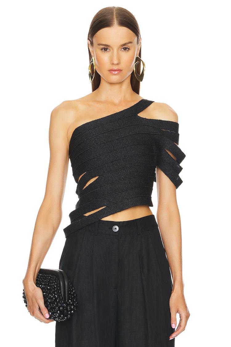 Bold cut-outs and an asymmetric neckline define this modern cropped top in matte black polyester. The fitted silhouette and off-shoulder strapless styling offer a sexy, edgy vibe perfect for warm spring and summer nights. Featuring a hidden side zipper closure for a sleek finish, this top is versatile for casual outings, date nights, or a night out with friends. Its unique raffia yarn strap detail adds subtle texture and interest, making it a statement piece that elevates any look effortlessly.