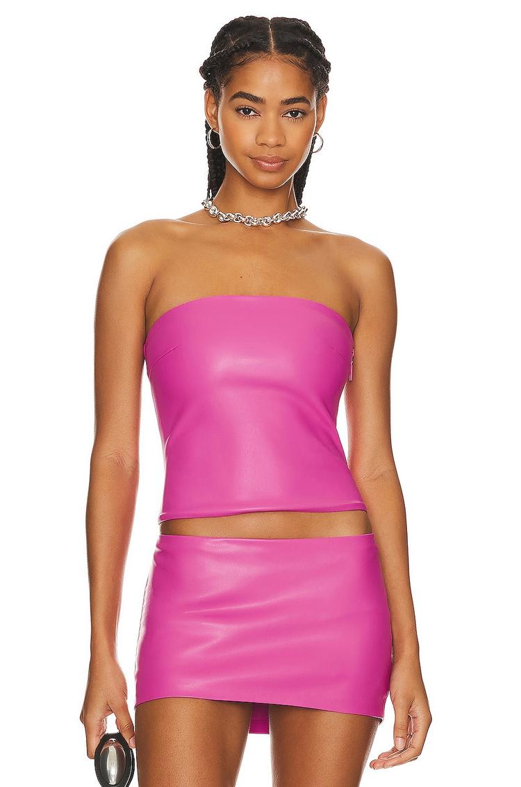 Vibrant matte fuchsia leather brings a bold edge to this fitted bandeau top featuring a straight neckline and strapless sleeve styling. The cropped length and boned back detail with a hidden side zipper closure create a sleek silhouette perfect for summer nights. Crafted from a blend of polyester, polyurethane, cotton, and elastane, this modern piece combines comfort with standout style. Ideal for casual outings, night outs, or parties, it offers a confident, sexy vibe that elevates any ensemble with its contemporary flair.