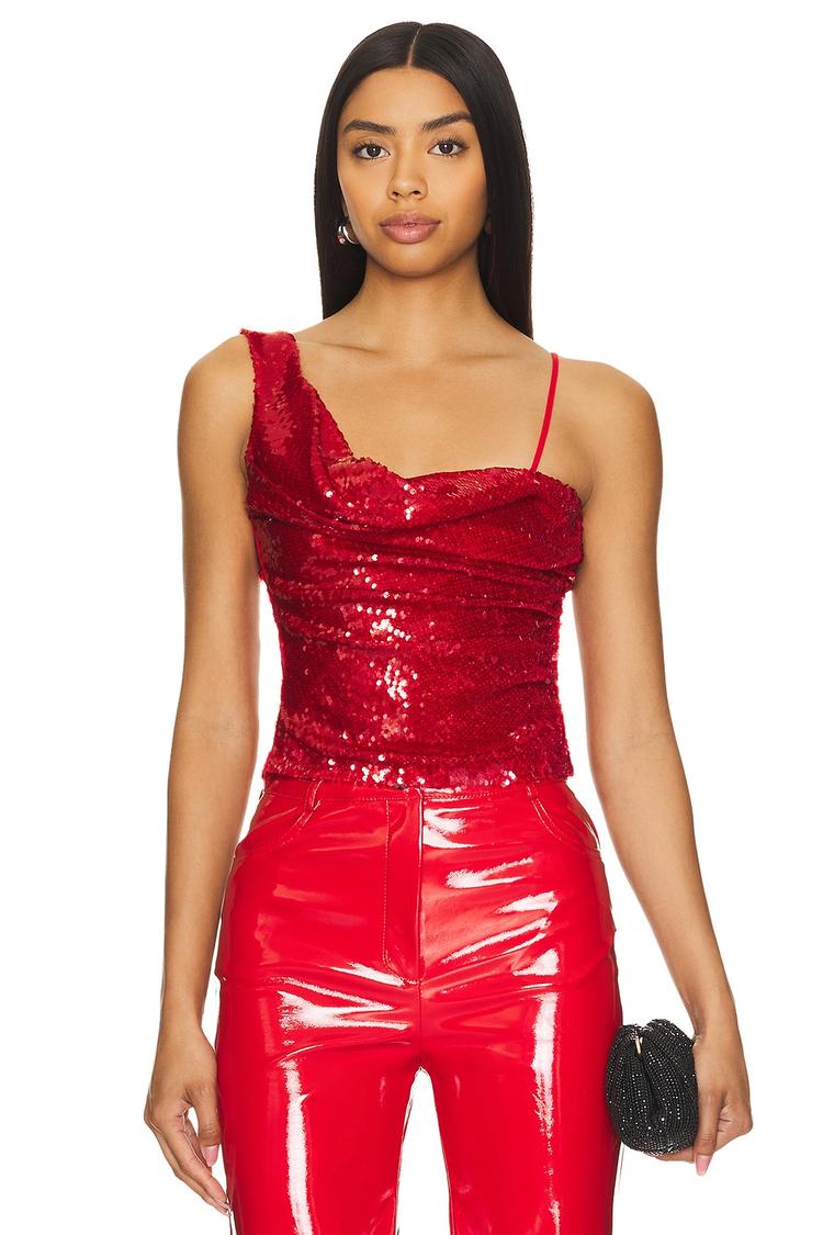 Glowing with red sequins and a draped neckline, this fitted camisole features asymmetrical shoulder straps with a detachable detail for versatile styling. Crafted from a lightweight blend of viscose, elastane, and lurex, it offers a shimmering finish that catches the light beautifully. The waist-length hem and sleeveless design create a sleek silhouette perfect for night outs, cocktail parties, or girls' nights. Its chic, trendy vibe makes it an eye-catching choice for fashion-forward occasions where you want to stand out with subtle glamour.