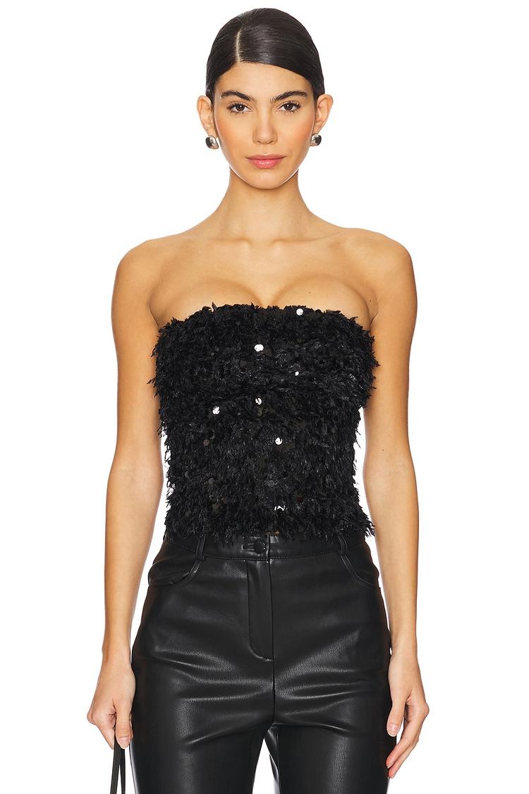 Shimmering black sequins adorn this fitted bandeau top, creating a sleek and sexy silhouette perfect for night outs and cocktail events. Crafted from a cotton blend with a boned bodice and non-stick silicone grip trim, it ensures comfort and secure wear. The strapless neckline and sleeveless styling highlight the shoulders, while the raw cut frayed hem adds an edgy modern touch. Hidden side zip closure enhances the clean lines, making this waist-length top a chic choice for date nights or stylish evenings.