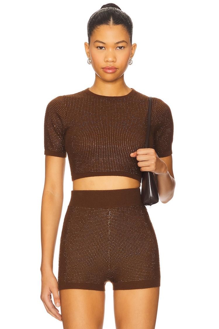 Midweight knit crafted from a luxurious wool-cashmere blend, this fitted cropped top features a classic crew neck and half sleeves for a sleek silhouette. The rich matte brown hue is elevated by delicate all-over rhinestone embroidery that adds subtle shimmer and sophistication. Designed for pull-on ease, it offers versatile wear for casual outings, brunch dates, or elegant evenings in cooler seasons. Its minimalist yet refined style brings a quiet luxury feel, perfect for layering or making a statement on its own.