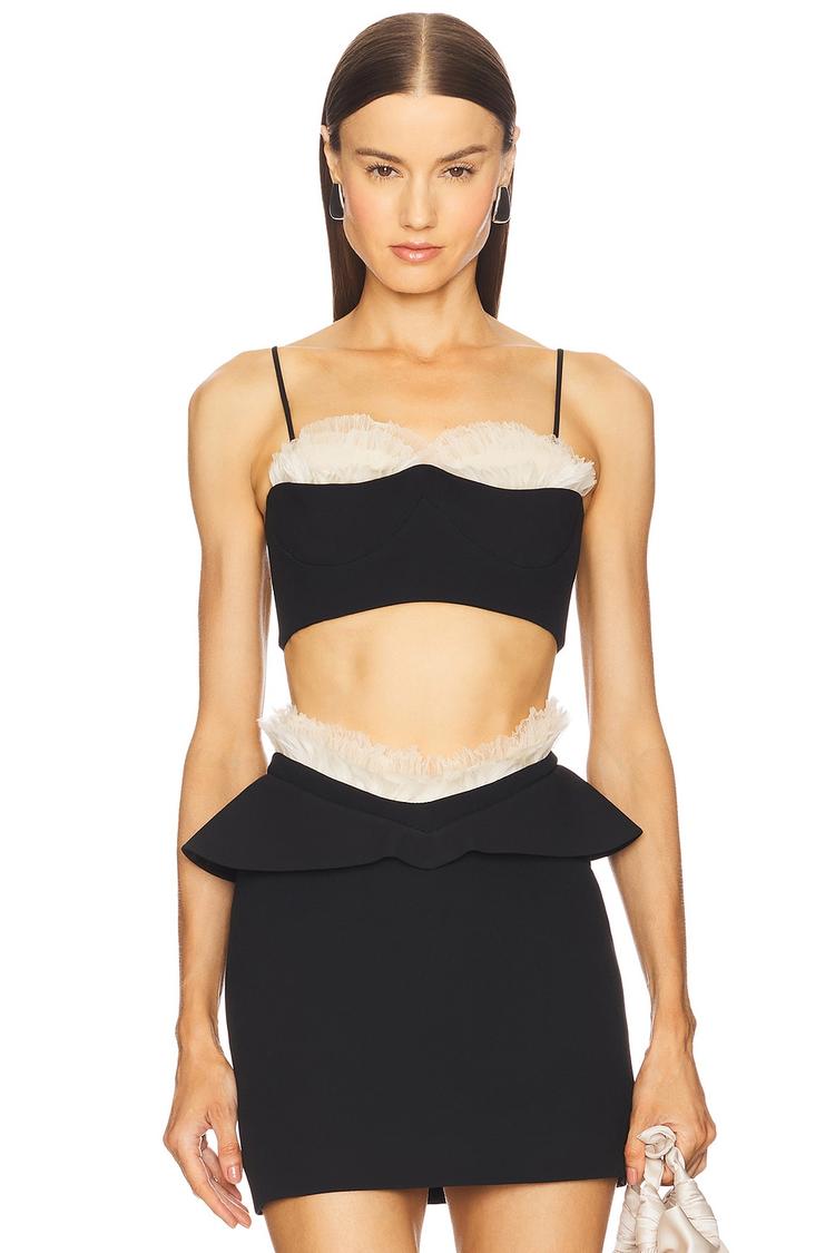 Delicately crafted with a matte black crepe fabric, this fitted bralette features a sweetheart neckline and slender spaghetti straps for a sleek silhouette. The cropped length is accentuated by sheer off-white ruffle and feather details at the cups, delivering an elegant and modern vibe. An exposed back zipper closure adds a subtle edge while ensuring a perfect fit. Ideal for spring and summer evenings, this chic piece is perfect for cocktail parties, night outs, and romantic dates, offering a refined yet sexy statement for your wardrobe.
