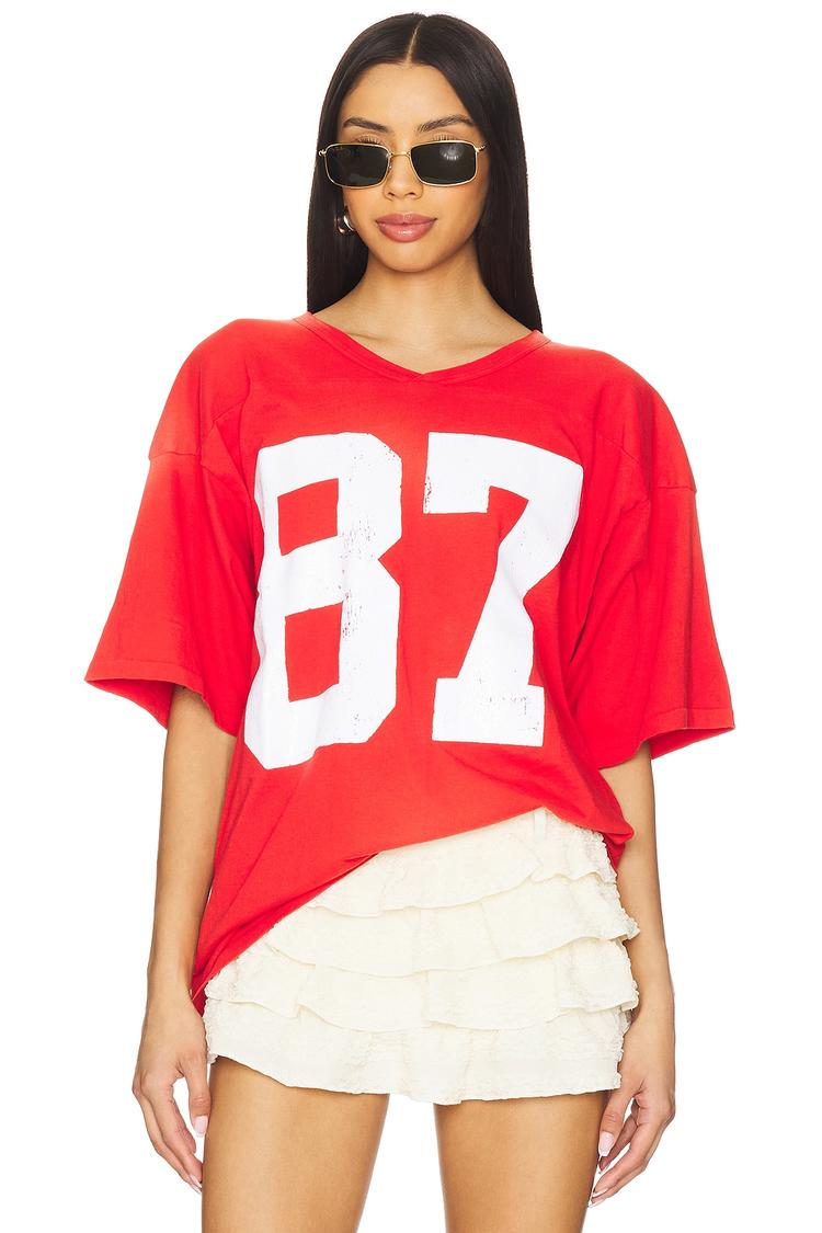 Bold and relaxed, this oversized athletic jersey in vibrant red features a classic V-neck and half sleeves that offer casual comfort. Crafted from 100% cotton midweight jersey fabric, it delivers breathable softness perfect for everyday wear. The hip-length silhouette and loose fit make it ideal for streetwear, loungewear, and casual outings. Distinctive large white '87' graphics adorn both front and back, adding sporty flair to your look. Effortless pullover styling completes this versatile piece designed for all seasons and easy layering.