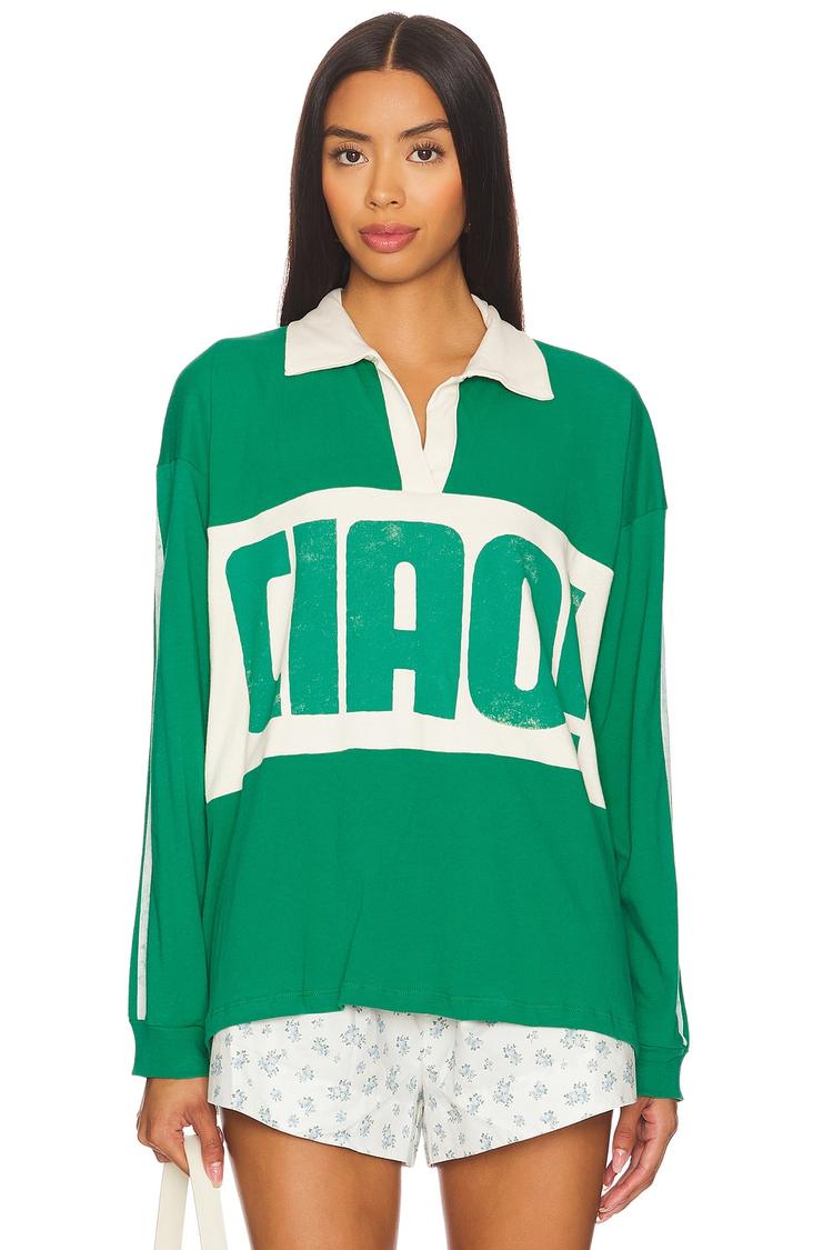 Bold green cotton jersey combines with a classic polo collar and long sleeves to create a relaxed, loose fit rugby top. The hip-length silhouette features a striking white graphic print across the front and contrasting white stripes down the sleeves, giving it a sporty street style vibe. This pullover henley top is perfect for casual days, everyday wear, or laid-back streetwear looks. Its breathable cotton fabric ensures comfort and versatility across all seasons.