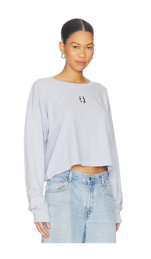 DAYDREAMER COW PATTERN HORSESHOE MEET & GREET LONG SLEEVE TOP IN BABY BLUE.
