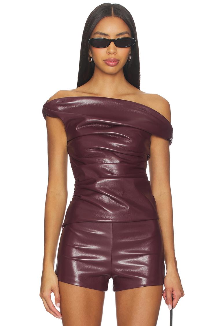 Bold and modern, this matte dark burgundy faux leather top features an off-shoulder neckline with an asymmetrical construction that adds edge to your look. The fitted silhouette is enhanced by ruching details at the sides, creating a flattering shape. A hidden side zipper ensures a sleek finish. Perfect for night outs, cocktail parties, or date nights, this chic piece offers a confident, sexy vibe with versatile all-weather wearability.
