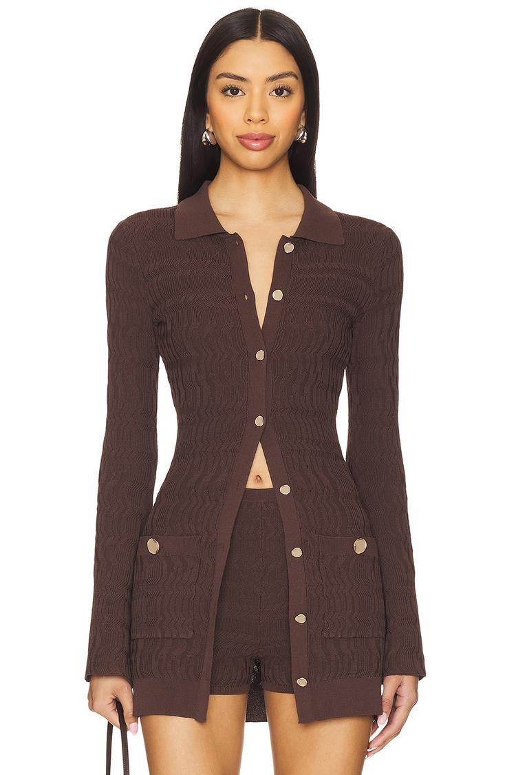 Rich matte brown viscose-nylon blend creates a sleek, fitted tunic with a classic collar and long sleeves. The mini length and front gold-tone button closure emphasize a polished, minimalist style, while functional slip pockets add subtle charm to the front. Perfect for autumn and winter, this chic piece transitions effortlessly from casual days to business casual settings, offering versatile wearability. Clean hemline and metallic gold buttons enhance its timeless appeal, making it an elegant choice for workwear, casual outings, or refined day events.
