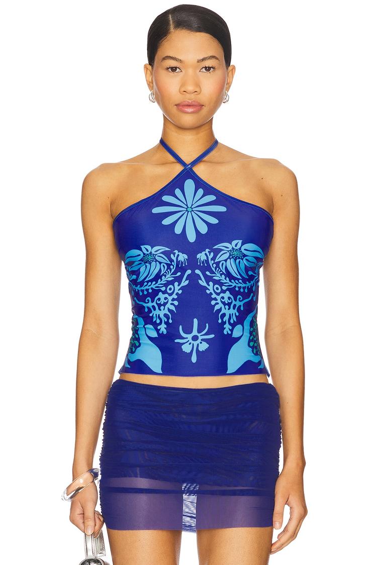 A vibrant matte dark blue cropped halter top with a fitted silhouette and sleeveless design, crafted from a midweight polyester-elastane blend. The all-over light blue floral print creates a striking contrast, while the self-tie halterneck closure adds a playful, adjustable element. Perfect for spring and summer, this bohemian-inspired top shines at casual brunches, lively nights out, or relaxed weekend gatherings. Its chic style and breathable fabric promise comfort and flair in equal measure.