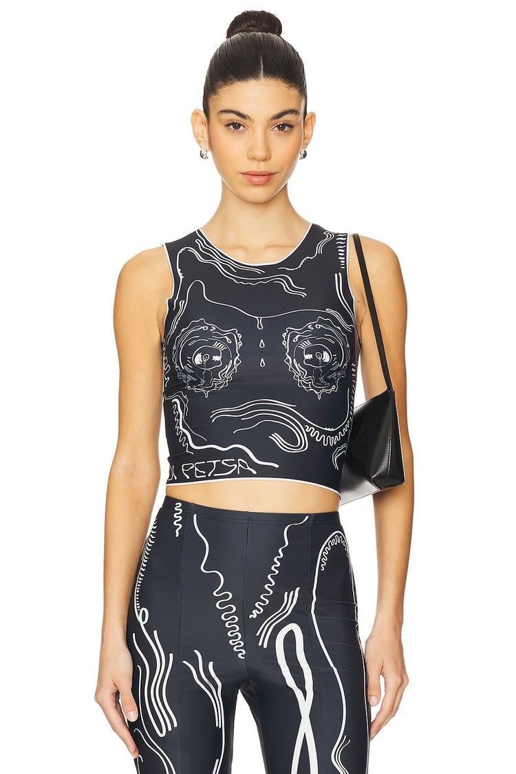 Sleek and fitted, this cropped lycra top features a striking abstract wrap-around print and a front slogan detail that adds edge to your athleisure wardrobe. Crafted from a lightweight, slinky jersey fabric blend of polyester and elastane, it offers a comfortable stretch fit with wide straps and a classic round neckline. Ideal for casual wear, workouts, or street style, its breathable construction and pullover design ensure ease and versatility for all seasons.