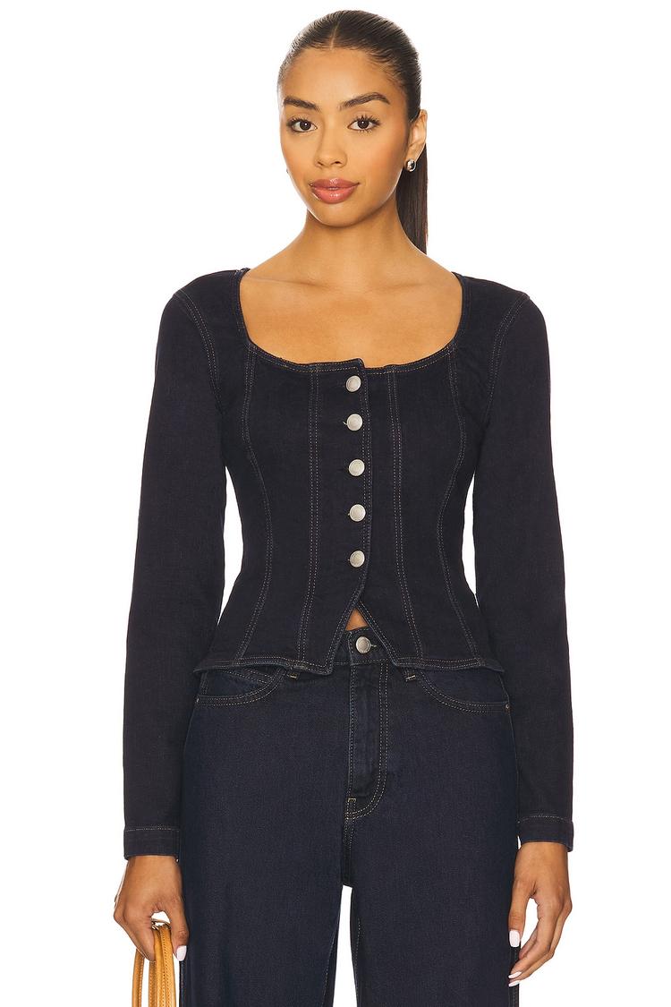 Structured with a fitted silhouette and a square neckline, this cropped denim top features long sleeves and a front button closure that adds a refined touch. Crafted from a midweight cotton blend with a touch of stretch, it offers both comfort and shape retention. Contrast stitching highlights the seams, enhancing its classic yet modern appeal. Ideal for casual outings, business casual settings, or weekend brunches, this versatile piece pairs effortlessly with high-waisted bottoms for a polished, minimalist look.