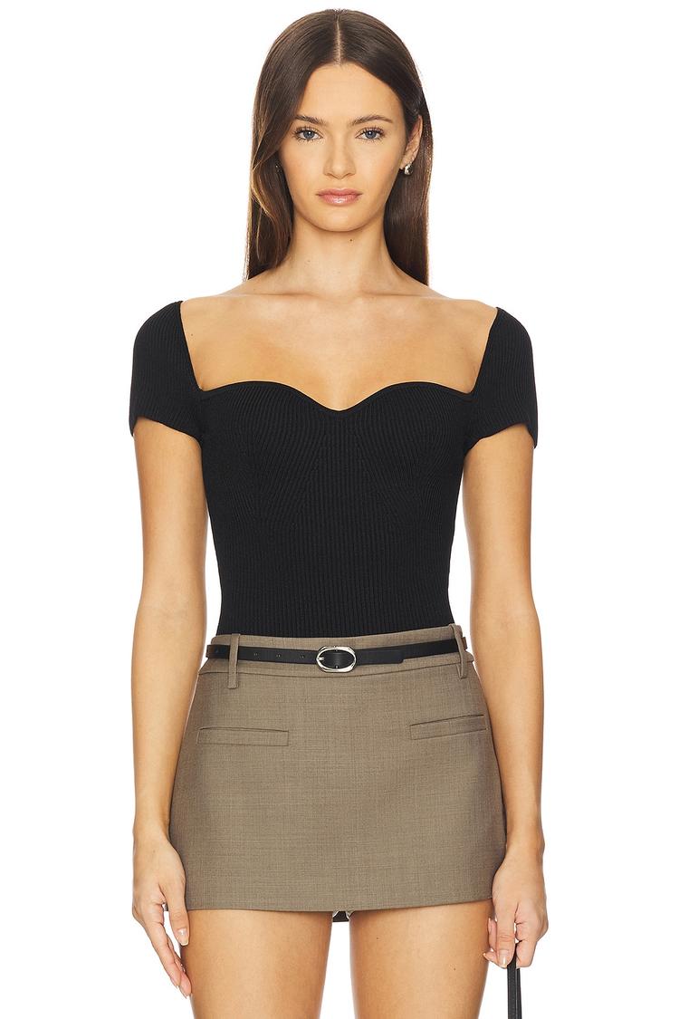 Soft midweight jersey fabric shapes this fitted knit top with a flattering sweetheart neckline and half sleeves, offering a timeless silhouette in matte black. The hip-length hem and pullover styling provide comfortable ease, making it a versatile choice for casual outings, date nights, or everyday wear. Its minimalist and chic design pairs effortlessly with skirts or trousers, reflecting classic elegance with a modern touch.
