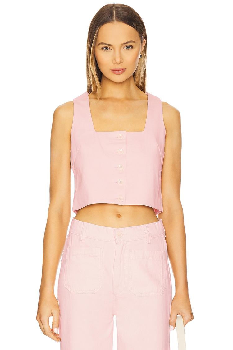 Soft matte light pink cotton-linen twill fabric shapes this cropped top with a square neckline and wide straps for a fresh minimalist vibe. Its regular fit and sleeveless design ensure comfort and ease, while the front button closure adds subtle detail. Perfect for spring and summer casual outings, brunch dates, or everyday wear, this versatile piece pairs effortlessly with high-waisted bottoms for a chic, relaxed look.