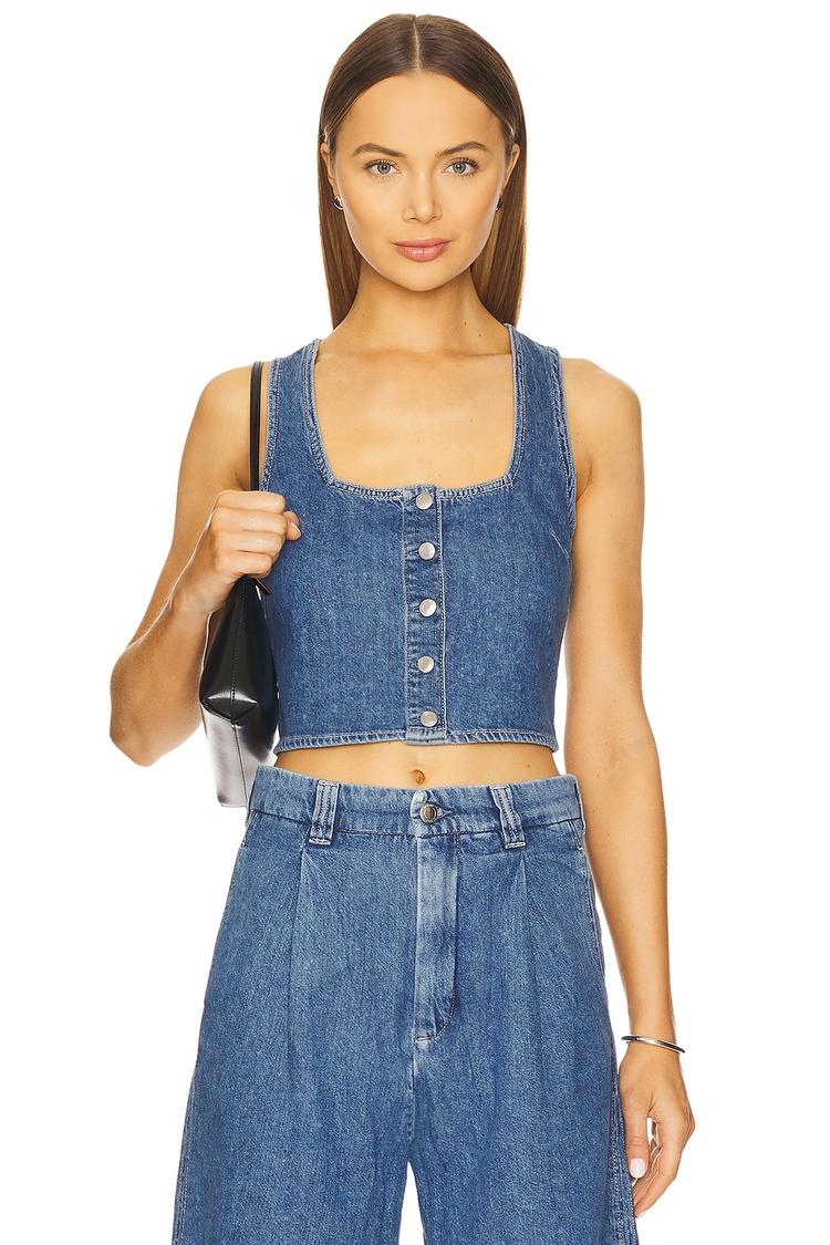 Midweight denim crafted from a cotton and Lyocell blend defines this fitted cropped top with a square neckline and wide straps. The front button closure adds a classic touch to its modern casual chic style. Ideal for spring and summer, this versatile piece pairs perfectly with high-waisted jeans or skirts for brunch, casual outings, or streetwear looks. Its clean, solid matte blue finish and sleeveless design offer a fresh, breathable option that complements a relaxed yet polished wardrobe.