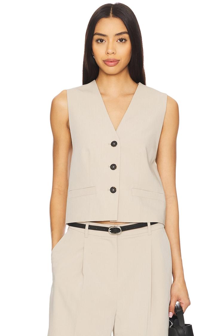Tailored in a midweight suit fabric, this beige sleeveless blouson vest offers a polished V-neck silhouette perfect for professional settings. Featuring a front button closure and faux welt pockets, it provides a classic, minimalist fit that pairs seamlessly with business casual and conference attire. The waist-length cut and covered back create a clean, sophisticated look that transitions effortlessly across seasons, making it an essential piece for workwear and refined occasions.