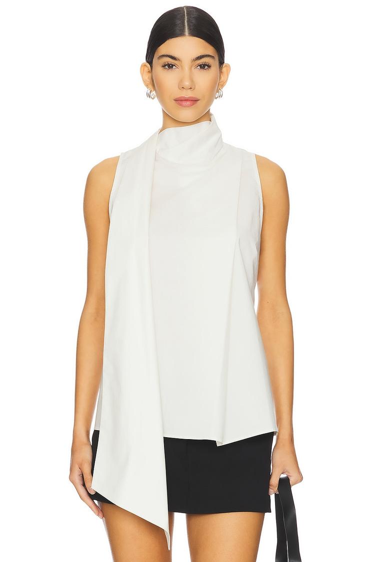 Crisp white cotton poplin and a high neck silhouette define this sleeveless shell top with an attached scarf that adds a touch of refined elegance. The regular fit and hip-length hem offer a flattering and versatile shape perfect for spring and summer. Featuring a back hook and eye clasp closure with a subtle keyhole back, this minimalist top pairs seamlessly with tailored trousers or skirts, making it ideal for casual days, workwear, business casual settings, and chic brunch or date nights.