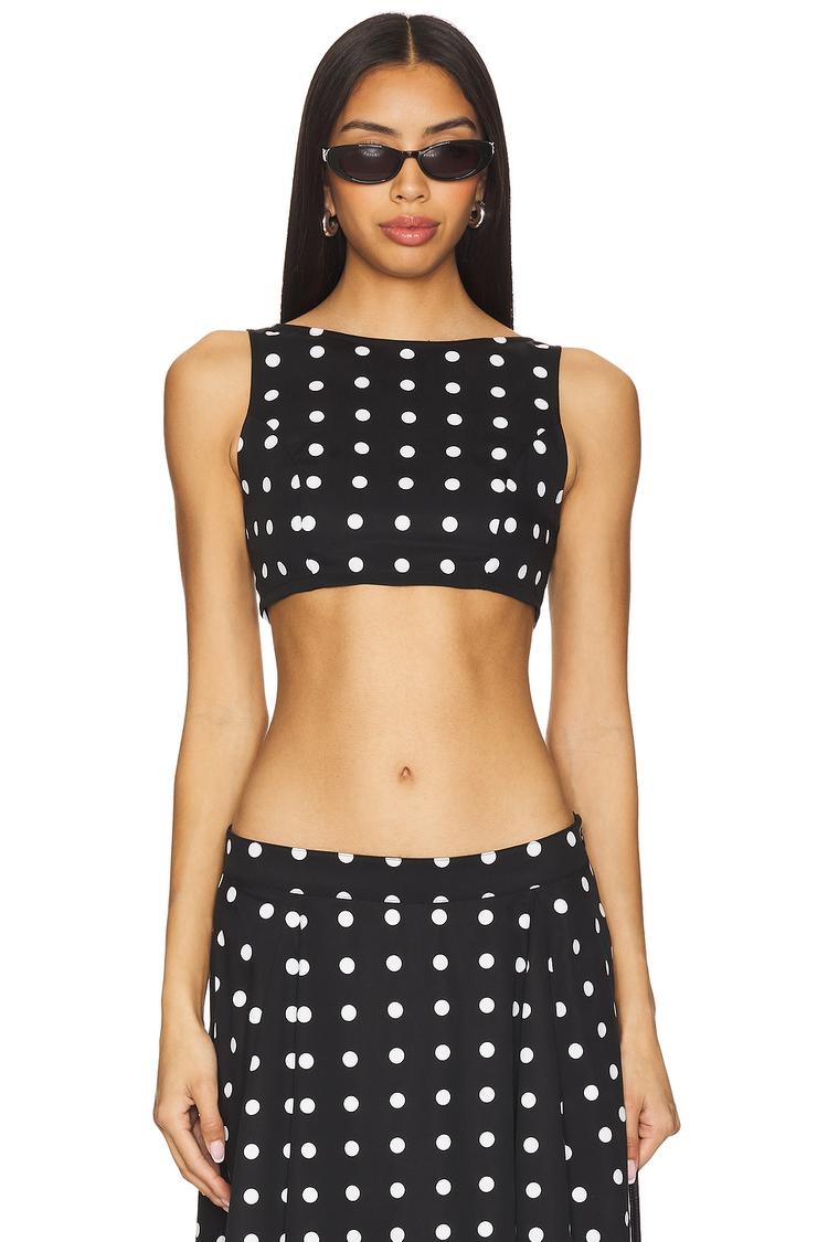Lightweight crepe viscose fabric and a fitted cropped silhouette define this sleeveless top with wide straps and a classic round neckline. Featuring an all-over white polka dot pattern on a matte black base, it fastens with an invisible back zipper for a sleek finish. Ideal for summer and spring outings, this minimalist city top pairs effortlessly with skirts or high-waisted pants, making it perfect for casual days, brunch dates, or relaxed evening occasions.