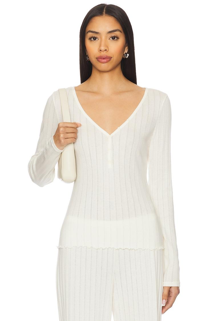 Softly textured with delicate pointelle knit, this slim-fit henley top in off-white offers a lightweight, semi-sheer jersey fabric crafted from cotton and modal. Featuring a flattering V-neckline and long regular sleeves, it is finished with a subtle front faux button closure and scalloped hem ruffles for a refined touch. Its hip length and minimalist design make it effortlessly versatile for casual outings, everyday wear, or travel, blending comfort with quiet elegance.