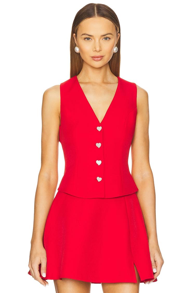 Bold and polished, this fitted shell top in vibrant red features a flattering V-neckline and sleeveless silhouette that enhances its classic appeal. Crafted from a comfortable polyester-spandex ponte fabric, it offers a sleek waist-length cut with front button closure adorned by bejeweled heart-shaped buttons for a chic touch. Perfectly suited for casual outings, brunch dates, or evening nights out, this top blends timeless style with a subtle sparkle, making it a versatile piece to elevate your wardrobe with sophisticated ease.