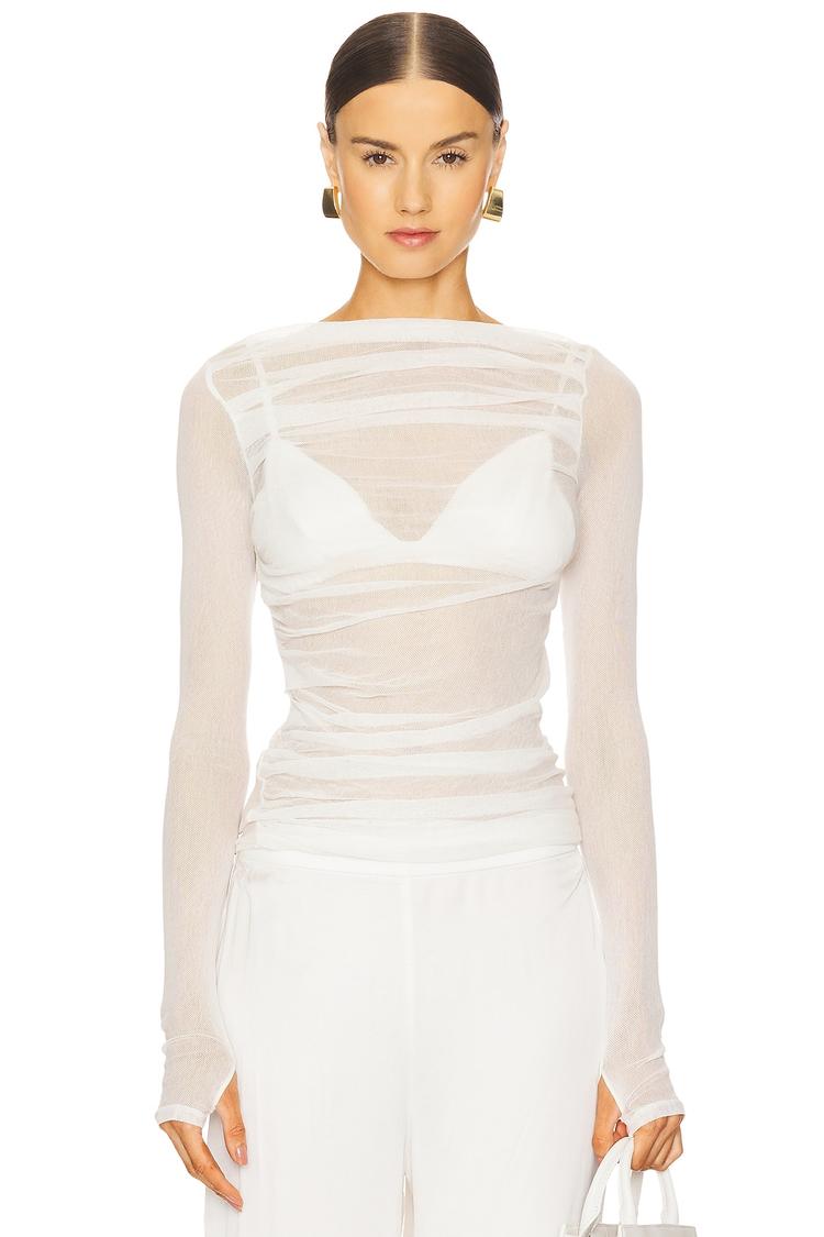 Delicately crafted from lightweight cotton mesh, this draped shell top features a sophisticated boat neck and slim fit that contours the body elegantly. The all-over ruffled design adds a modern texture, while long sleeves with thumbholes provide subtle functional flair. Its sheer, breathable fabric makes it perfect for spring and summer, ideal for casual outings, brunch dates, or polished workwear looks. The hip-length silhouette balances style and comfort effortlessly, embodying minimalist chic with a fresh, airy feel.
