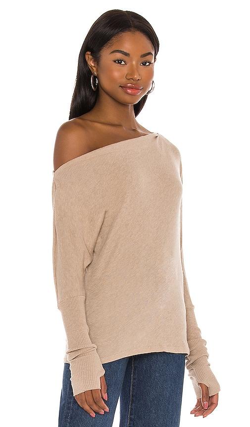 ENZA COSTA CASHMERE CUFFED OFF SHOULDER LONG SLEEVE TOP IN TAN.