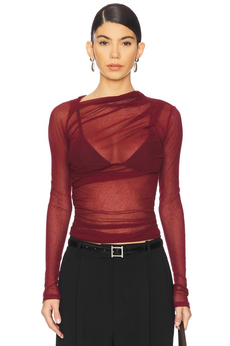 Sheer mesh fabric in a matte burgundy hue defines this longline top with a slim fit and classic round neck. Long regular sleeves and ruffled design details all over enhance its modern, chic silhouette. The pullover style and hip-length cut make it versatile for layering, ideal for casual outings, brunches, and date nights. Crafted from lightweight cotton mesh, it delivers breathability and a subtle sexy vibe that elevates everyday wear with a sophisticated edge.