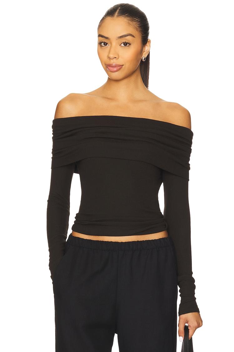 Softly folded off-shoulder neckline and heavyweight ribbed jersey fabric create a sleek, close fit with modern minimalism. This matte black pullover top features long sleeves and a waist-length hem, perfect for layering or wearing solo during cooler seasons. The clean silhouette pairs effortlessly with casual brunch outings, night outs, or relaxed weekend looks, offering both comfort and style with its luxurious rayon knit. A chic staple that balances cozy warmth with a subtle, sophisticated edge.