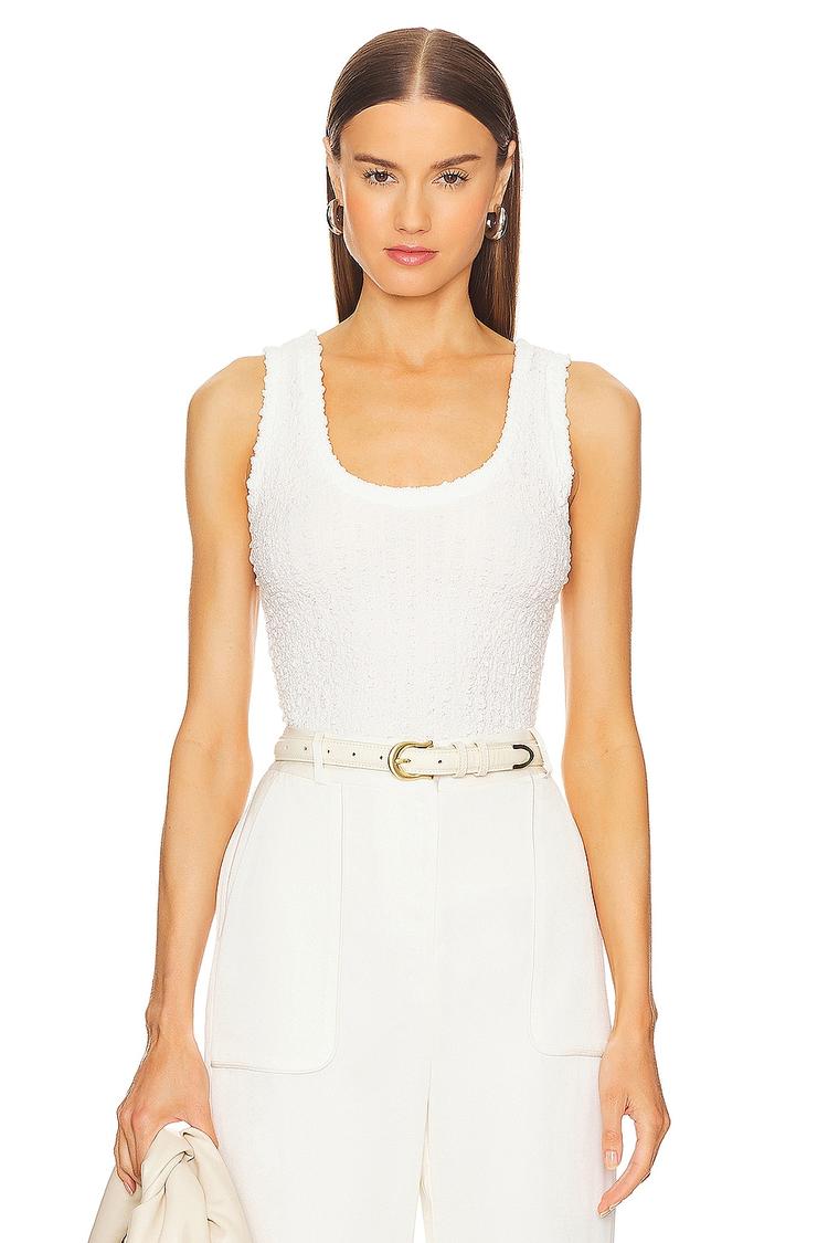 Soft, lightweight seersucker fabric shapes this slim-fit tank top, delivering breathable comfort in a clean white hue. Featuring a classic scoop neck and wide straps, its sleeveless design is perfect for warm weather styling. The waist-length cut offers versatile layering options, making it an ideal choice for casual days, travel, or everyday wear. Effortlessly minimal and chic, this tank pairs well with tailored trousers or relaxed denim, embodying a refined yet easygoing aesthetic.