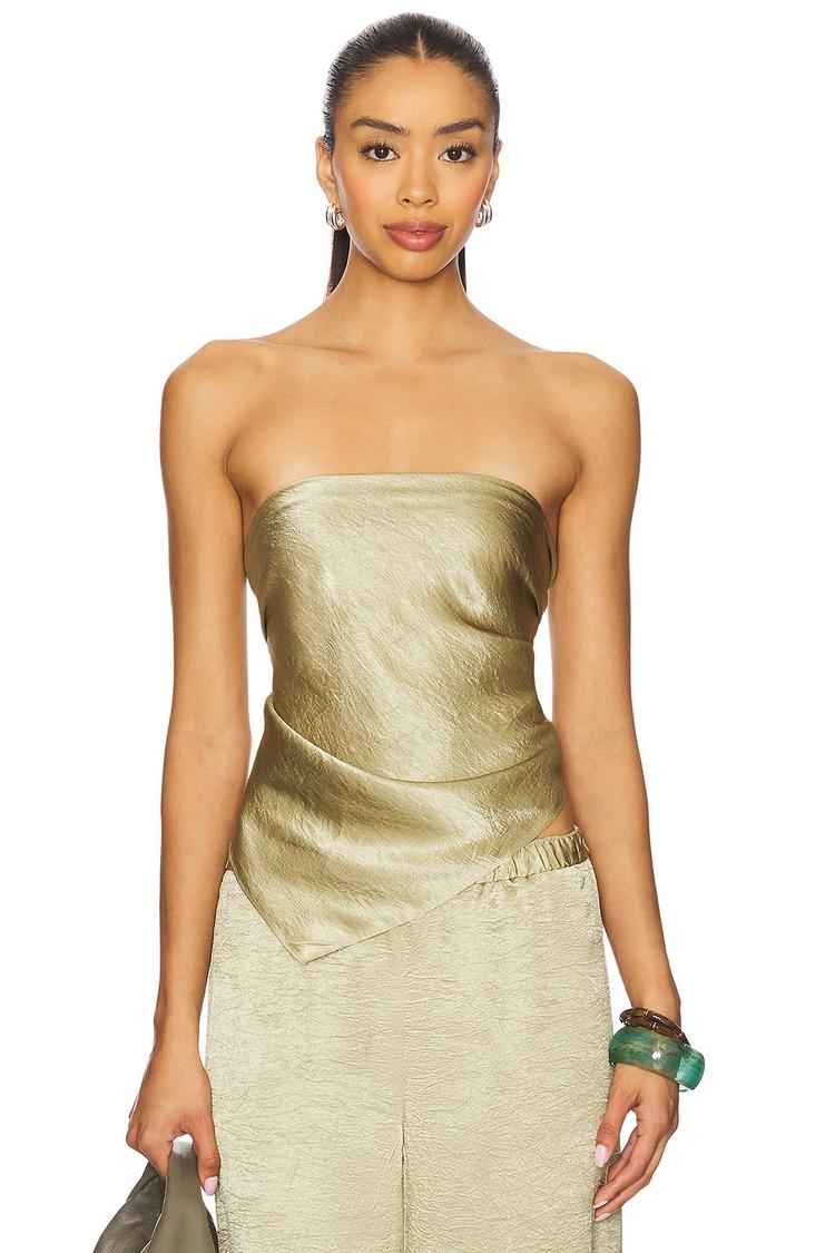 Shimmering in a light olive crinkle satin, this slim-fit bandeau wrap top boasts a strapless straight neckline and a chic tie-back closure that accentuates the waist length silhouette. The midweight fabric adds a subtle texture perfect for spring and summer days. Ideal for casual outings, brunches, or night outs, its modern minimalist design pairs effortlessly with a variety of looks, bringing a sexy edge to your wardrobe essentials.