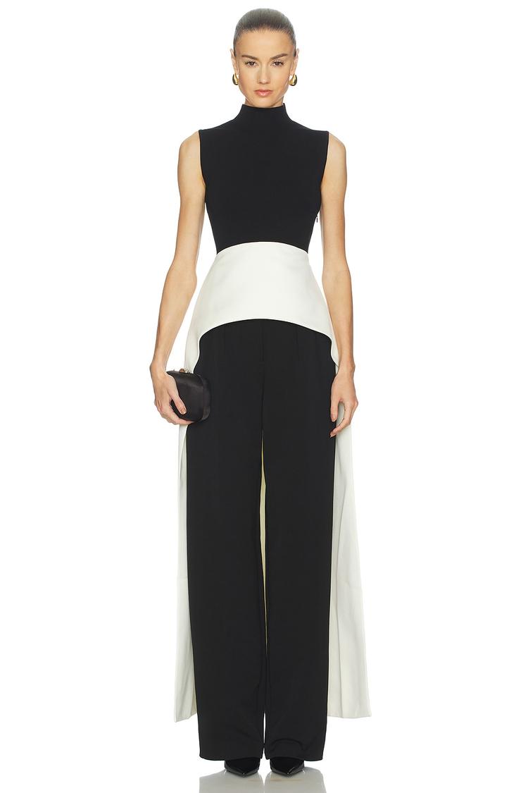 A striking combination of a matte black sleeveless tank with a sophisticated turtle neck and a dramatic white high-low hem cape, this knit combo top is crafted from a viscose-nylon blend with polyester lining for a refined texture. Featuring a close fit, side zipper, and button closure at the nape with a keyhole back, it exudes elegance and modern sophistication. Ideal for formal events, cocktail parties, and night outs, this versatile piece adds a statement layer with its long draping cape and high-low hem that elevates any ensemble.