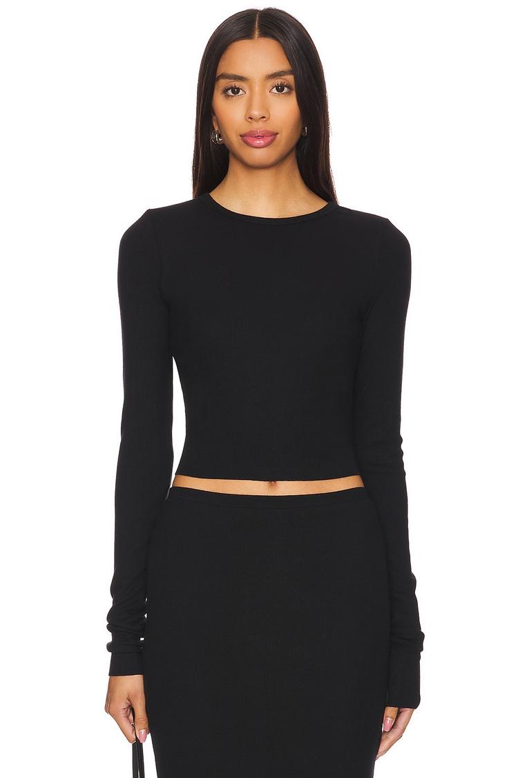 Soft stretch ribbed jersey fabric and a laser-cut hem define this cropped long sleeve fitted top in matte black. Featuring a classic crew neck and long regular sleeves, it offers a sleek minimalist silhouette that hugs the body comfortably thanks to its cotton, rayon, and spandex blend. Perfect for everyday casual wear, business casual settings, or a chic layered look, its versatile style and flattering cropped length make it a modern essential for all seasons.