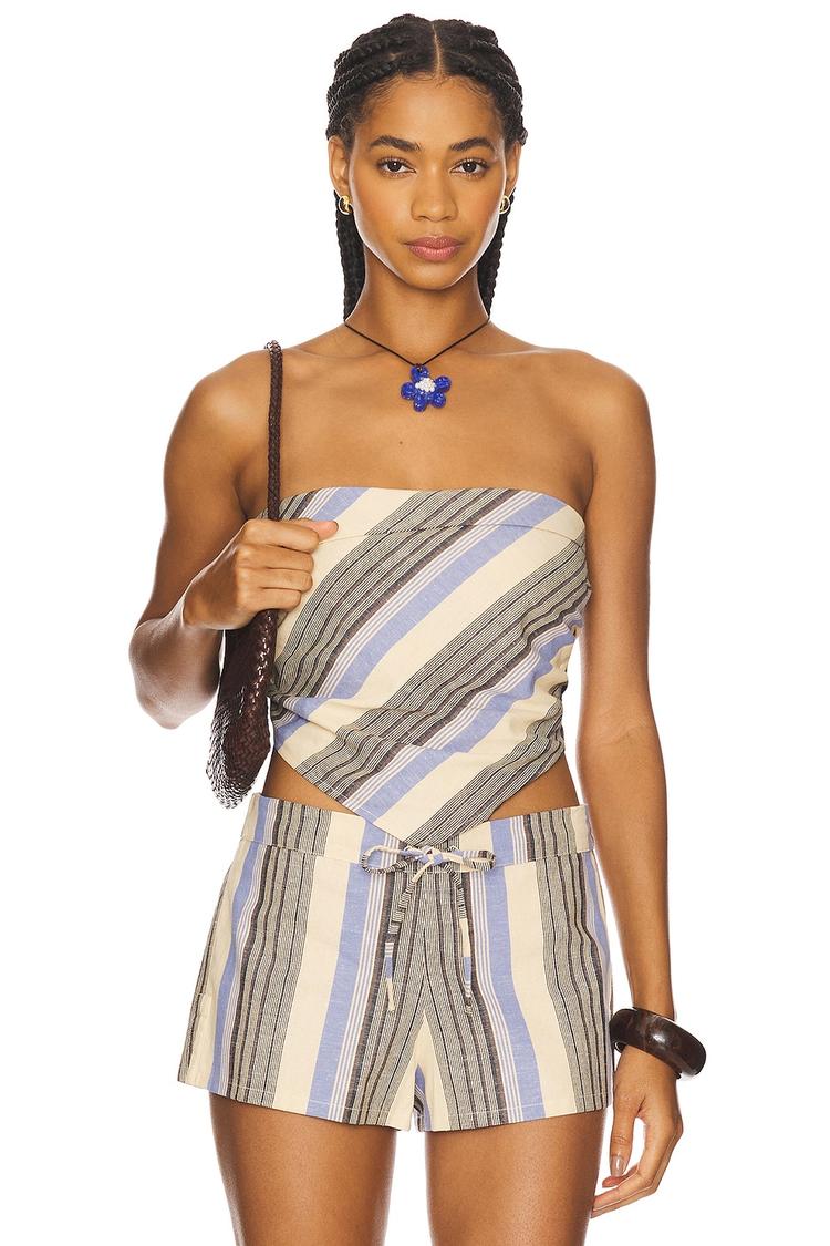 Lightweight cotton-linen blend fabric and a fitted cropped silhouette define this Antibes strapless top. Featuring a chic strapless neckline and sleeveless styling, its all-over muted striped pattern in beige, dusty blue, gray, and white adds subtle visual interest. The back elasticized panel ensures a secure and comfortable fit, making it an ideal choice for casual days, brunches, or vacation wear. This versatile piece pairs effortlessly with high-waisted bottoms for a breezy, bohemian-inspired look during spring and summer seasons.