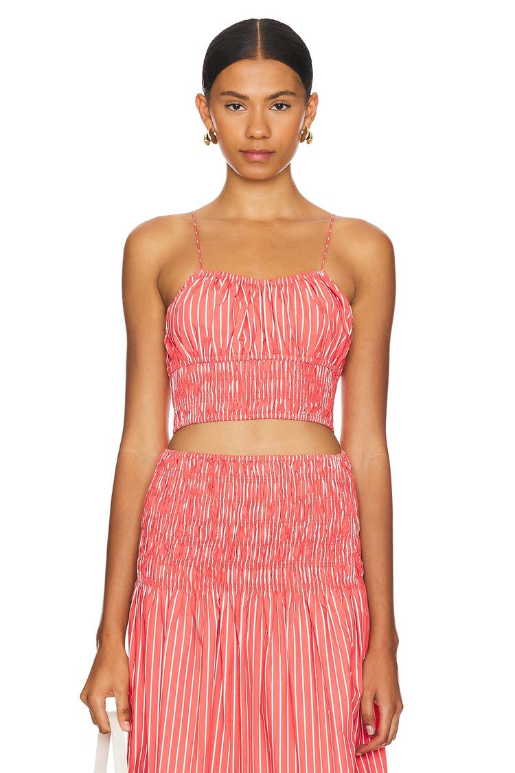 Bright coral stripes and delicate smocked detailing define this fitted cropped camisole featuring slender spaghetti straps and a straight neckline. Crafted from breathable 100% cotton, its lightweight fabric and sleeveless design make it an ideal choice for warm spring and summer days. This Baia Top blends bohemian charm with casual chic flair, perfect for casual outings, brunch dates, or vacation getaways. The slip-on style and all-over striped pattern add effortless style and comfort to your everyday wardrobe.