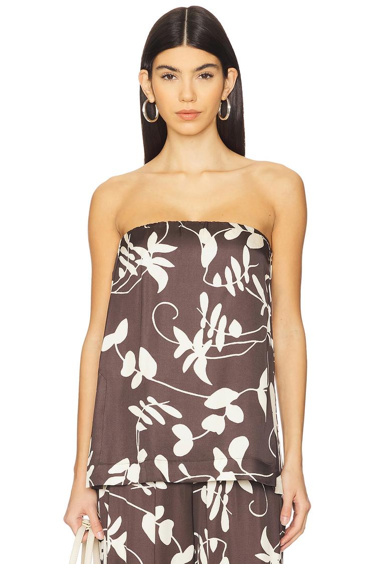 Softly draped in a midweight satin blend, this tube top features a relaxed fit and a strapless neckline that highlights the shoulders. The hip-length silhouette is adorned with an all-over off-white floral print on a deep brown matte base, perfect for warm spring and summer days. Its pullover style ensures effortless wear, making it an ideal choice for casual outings, brunches, or vacation escapes. The bohemian-inspired print and casual chic vibe add a stylish yet comfortable touch to your seasonal wardrobe.