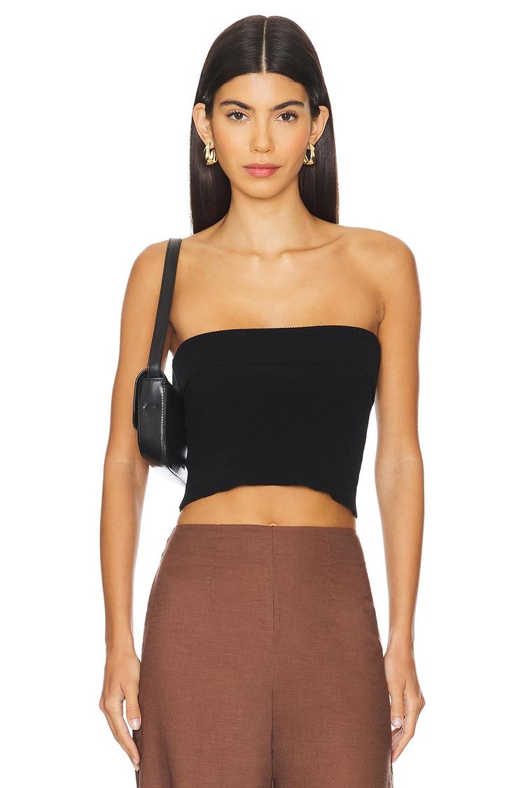 Sleek and modern, this fitted cropped bandeau top features a straight neckline and strapless sleeve styling, crafted in a ribbed knit fabric blend of cotton, nylon, and elastane. Its minimalist black hue and slip-on closure make it an effortlessly chic piece perfect for warm spring and summer days. Ideal for casual outings, brunch dates, or night out looks, this versatile piece pairs beautifully with high-waisted bottoms to create a confident, trendy silhouette.