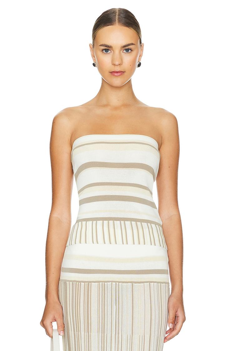 Striped in cream and beige, this bandeau top features a fitted silhouette that hugs the waist length hem perfectly. Crafted from a comfortable cotton-nylon blend, it offers a minimalistic and casual chic vibe with a straight, strapless neckline and sleeveless styling. Ideal for spring and summer days, this slip-on top pairs effortlessly for casual outings, brunch dates, or a relaxed vacation look, combining comfort with a timeless striped pattern and a clean covered back design.