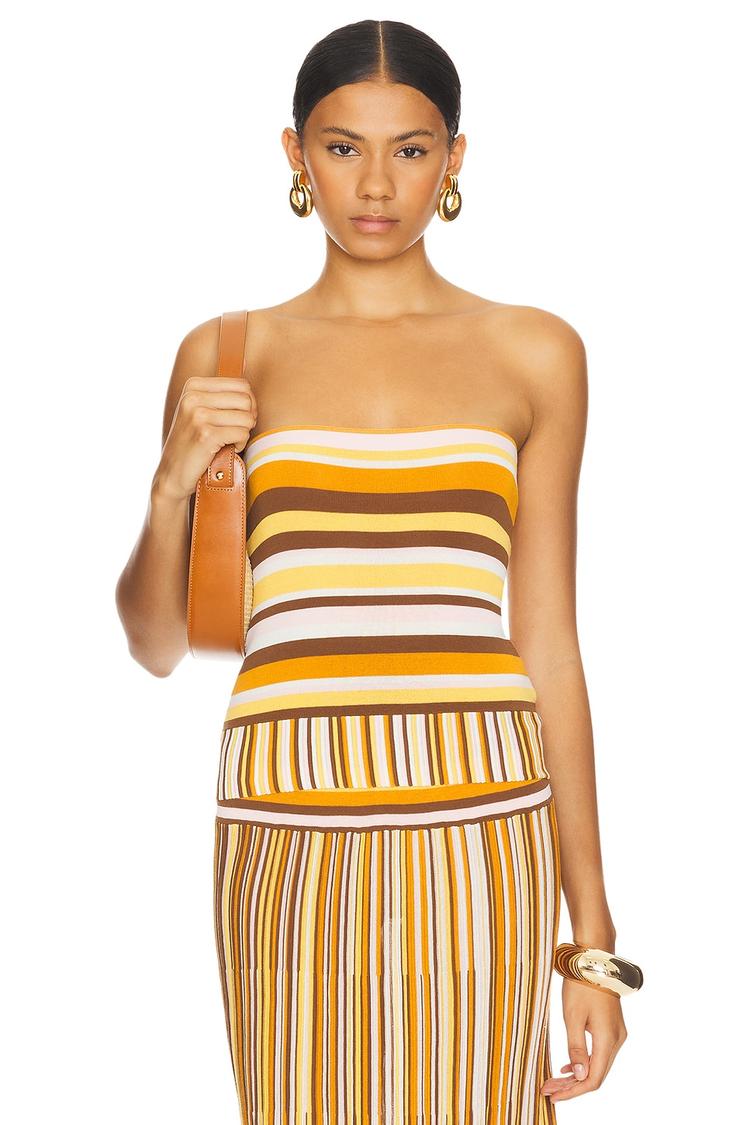 Striped in warm earthy tones, this fitted bandeau top features a strapless neckline and sleeveless styling, crafted in a soft cotton-nylon jersey blend for comfortable wear. Its waist-length hem and slip-on elastic neckline offer effortless style and ease, perfect for spring and summer days. This casual chic piece is ideal for brunch dates, casual outings, and vacation looks, blending boho chic vibes with a clean, versatile silhouette that pairs well with high-waisted skirts or pants.